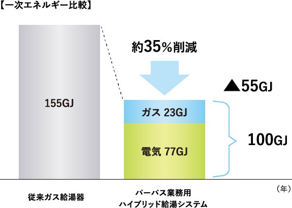 高効率のヒートポンプ給湯機をメインで稼働させるため、1日3,000リットル、42℃のお湯を一般的な業務用厨房で使用した場合、年間約47%のランニングコストを低減できます。