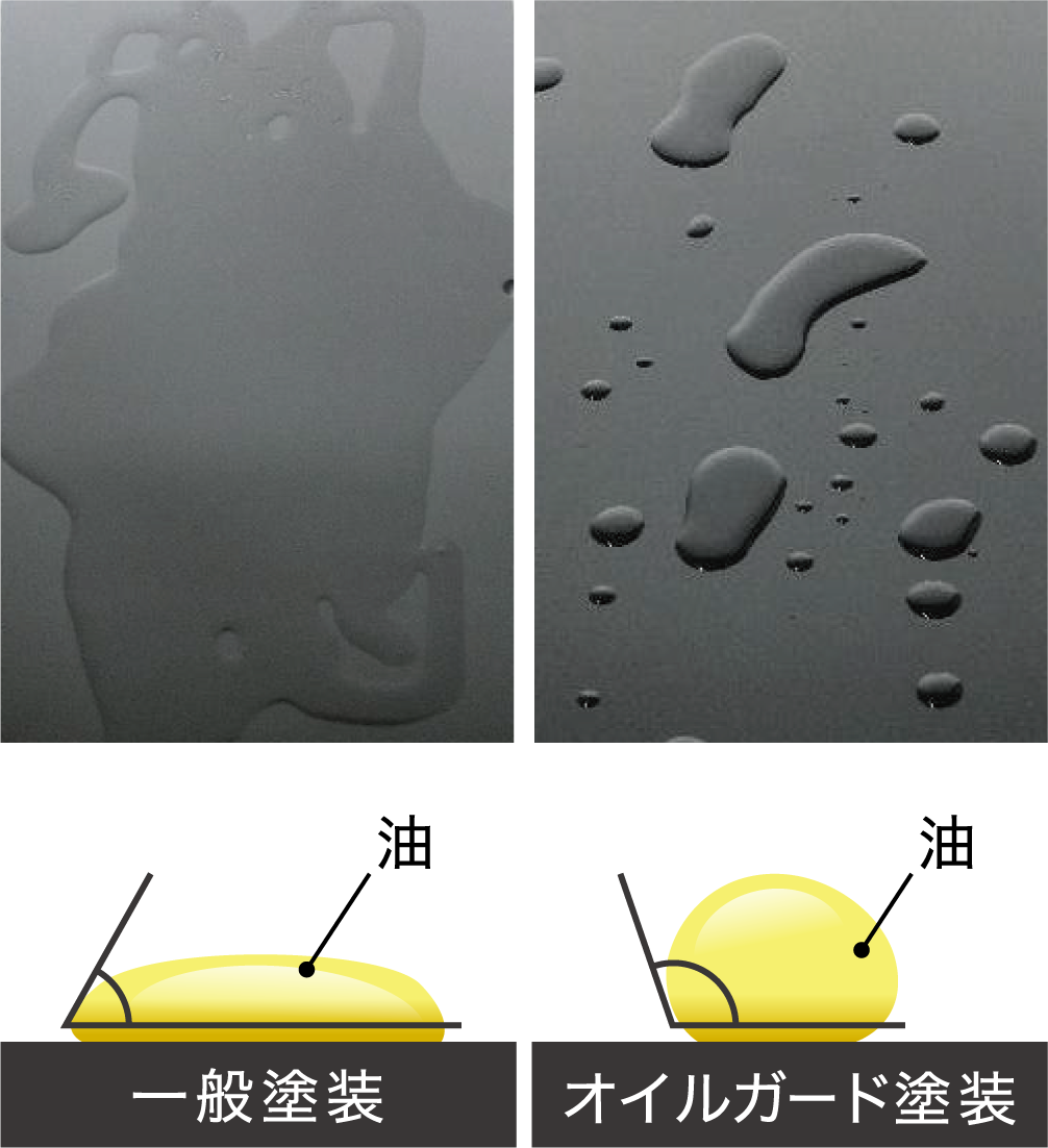 付着した油を玉状にする効果があります。玉状になることで油が付着し難く、お手入れの際はスポンジなどで簡単に洗い落とすことができます。