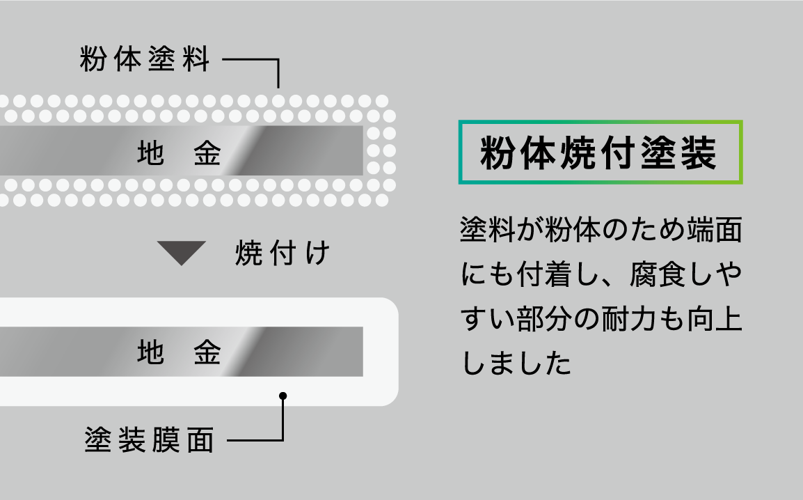 加工後に塗布できる粉体焼付塗装は、端面にも塗料が付着します。これによりサビなどの発生を防ぐことができます。