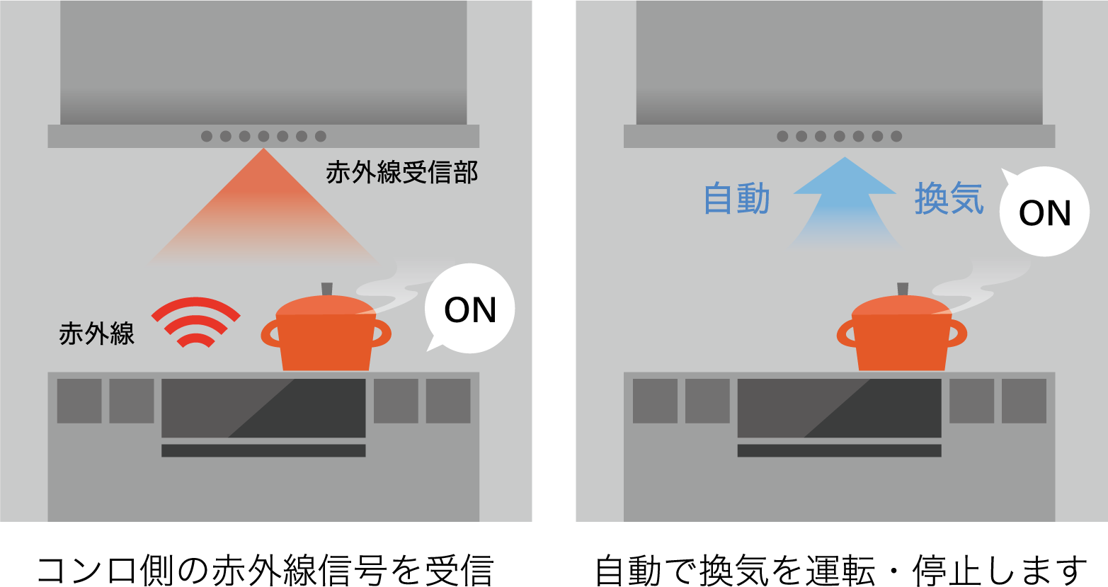 調理機器から送信される赤外線信号をレンジフードが受信して自動的に運転や停止を行います。そのため、調理中にレンジフードを操作する手間や消し忘れの心配がありません。